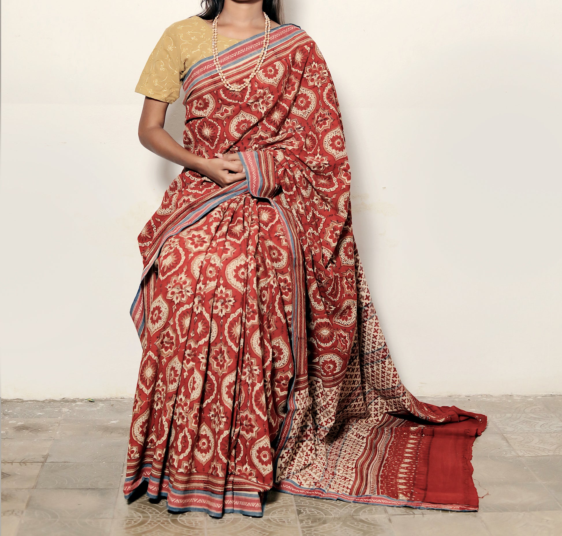 AJRAKH SAREE : ALIZARIN RED : KORA : KATHA BROWN