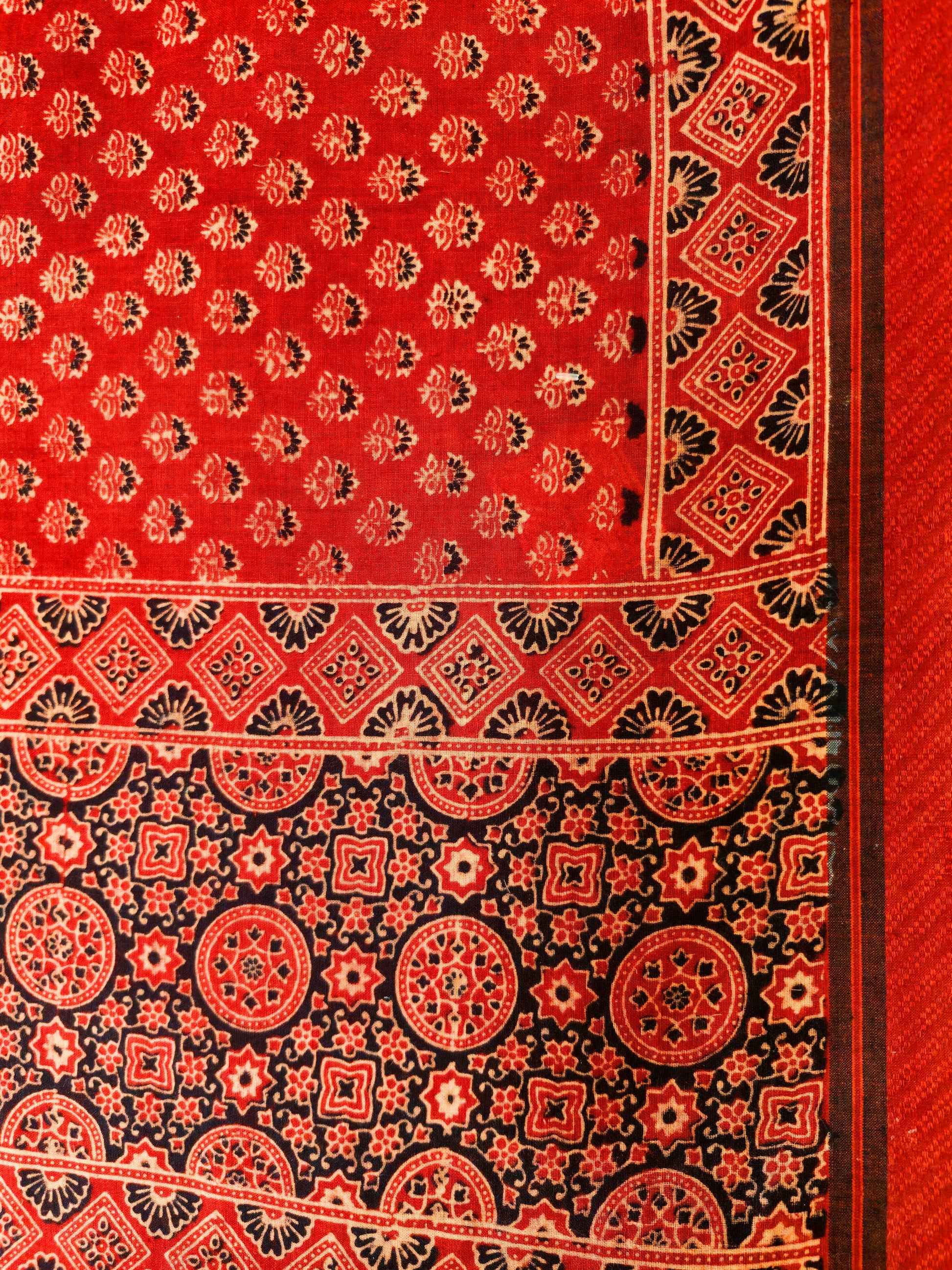 The specialised printing technique of the Kutch region of Gujarat; the origins and meanings of Ajrakh are as diverse as they are romantic. Some say it means “keep it today”, others that it is the Arabic word for indigo. Either way, the motifs are all geometric, harkening to their Islamic origin and the colors historically tend to be predominantly red and indigo.