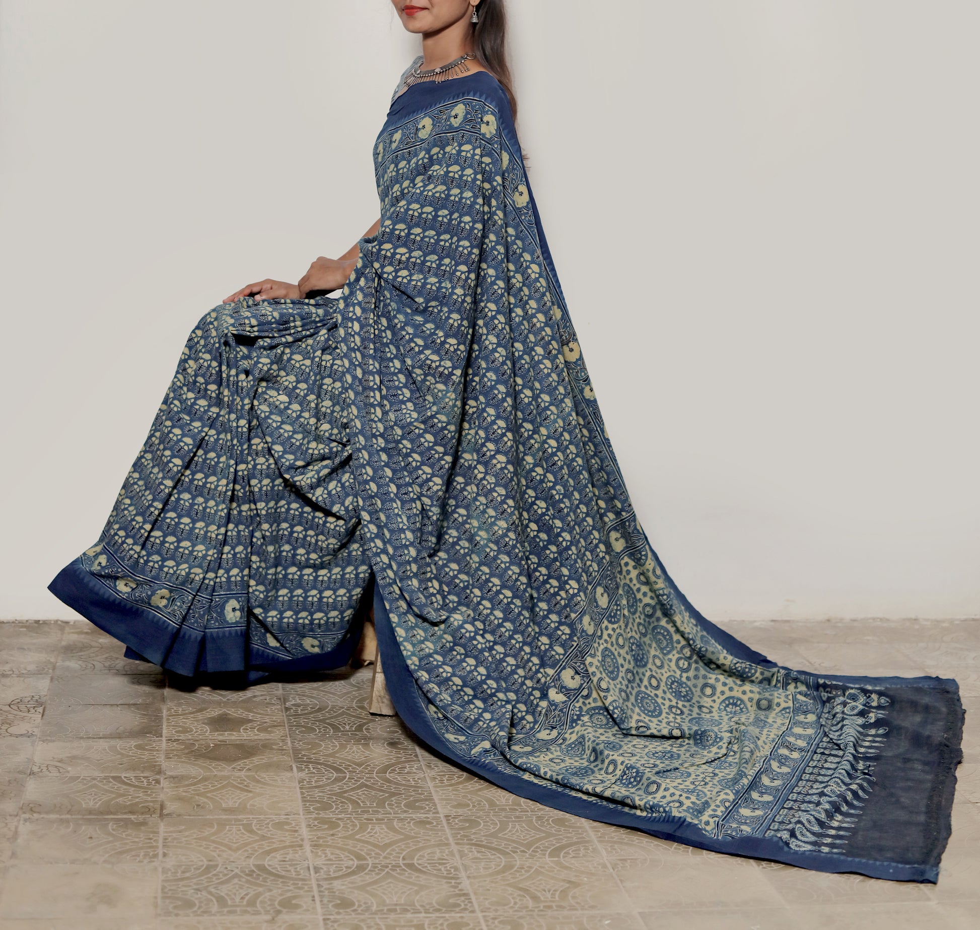 AJRAKH SAREE : DARK INDIGO : BLACK : ANAR YELLOW.