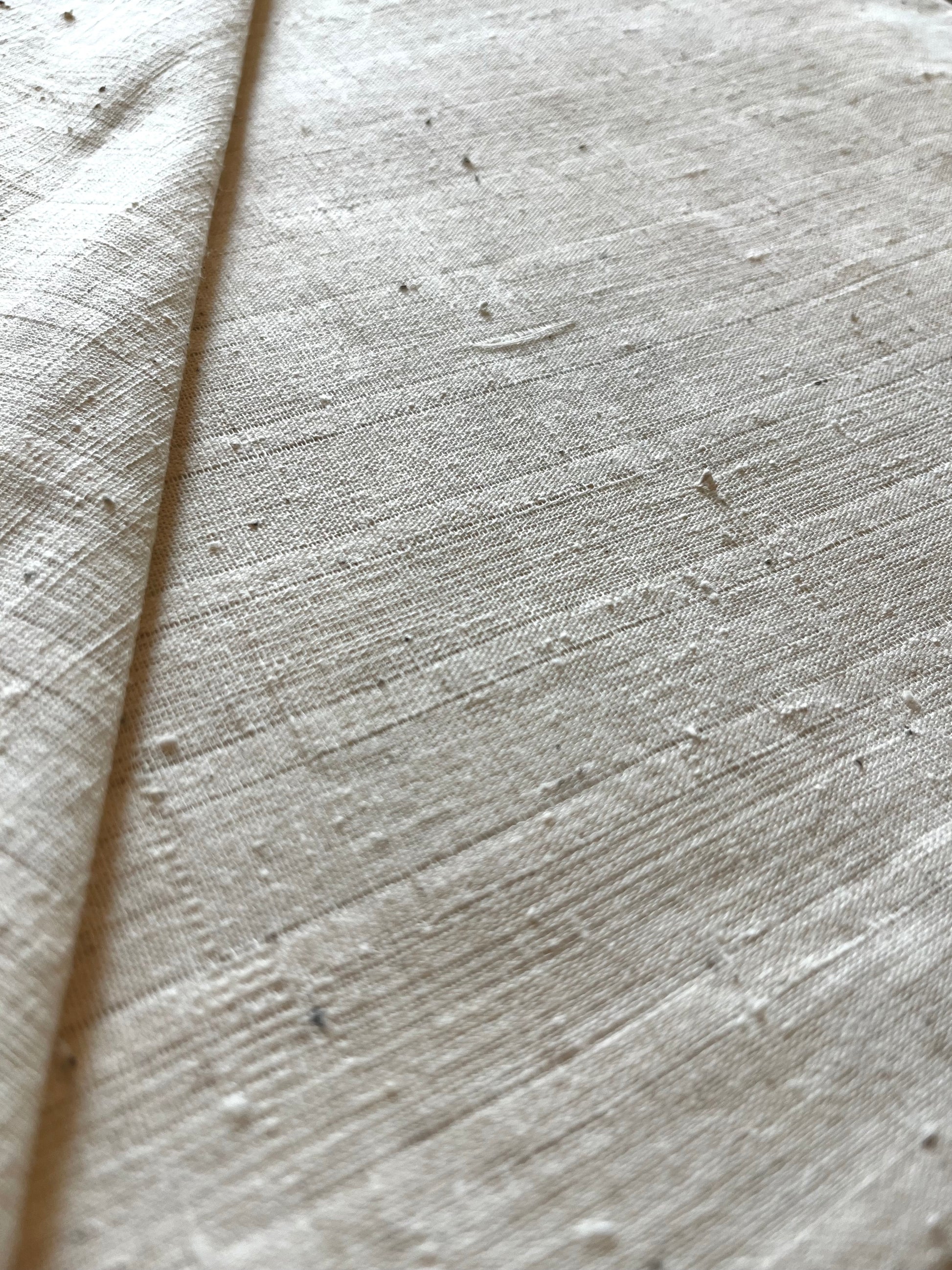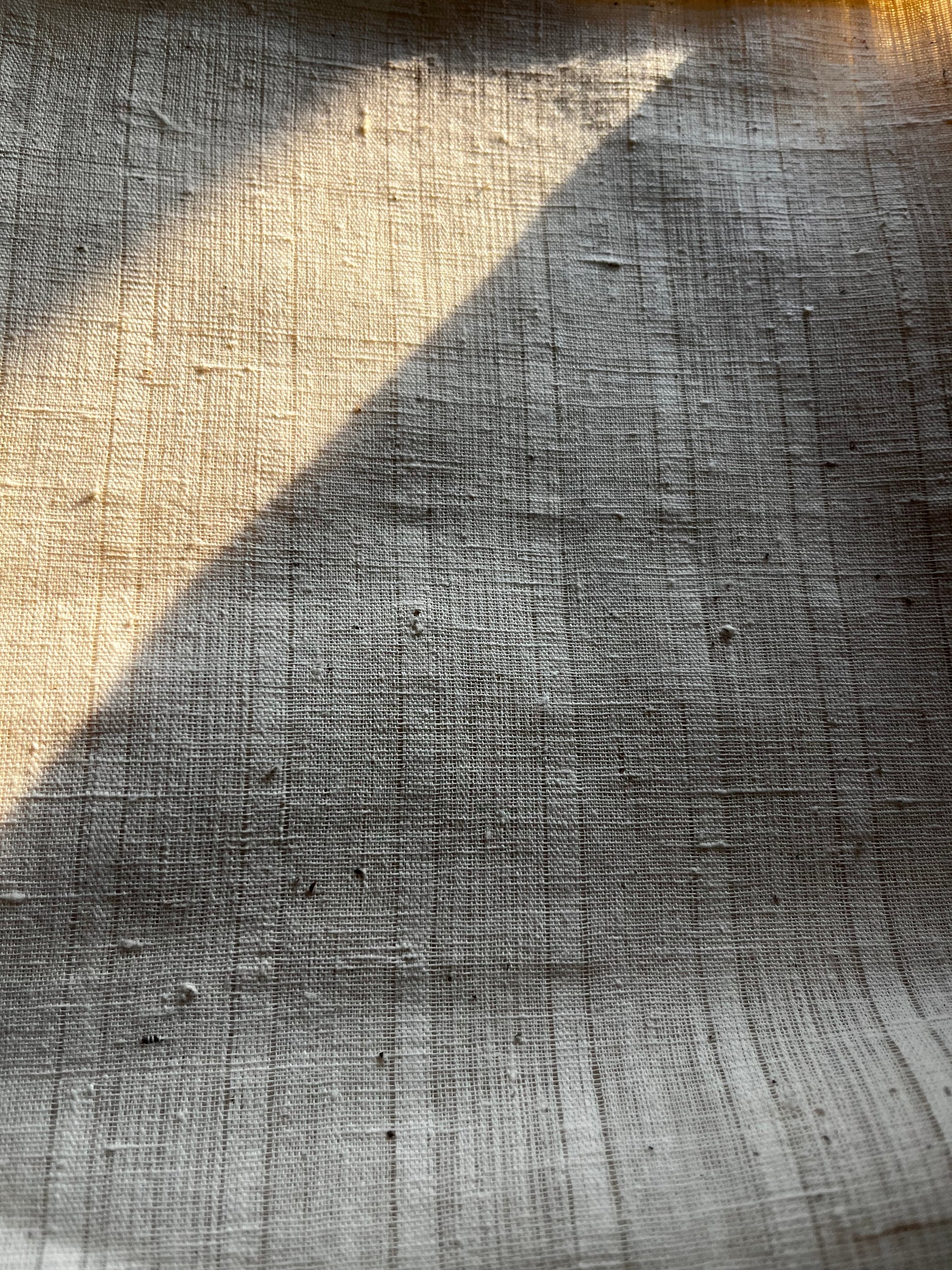 By varying the number of threads used in the warp, weavers achieve this subtle texture in the cloth, creating a pattern amid the plain white surface of the fabric.