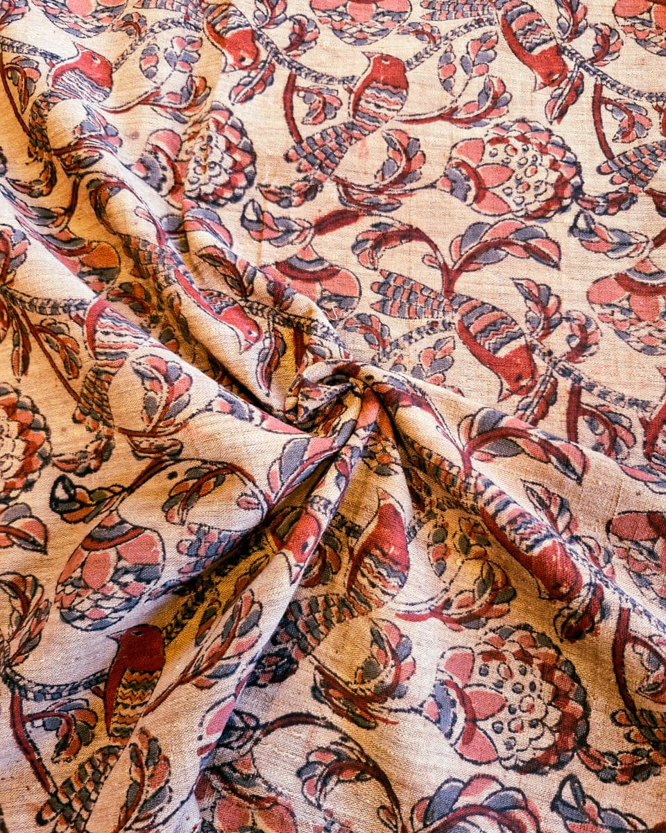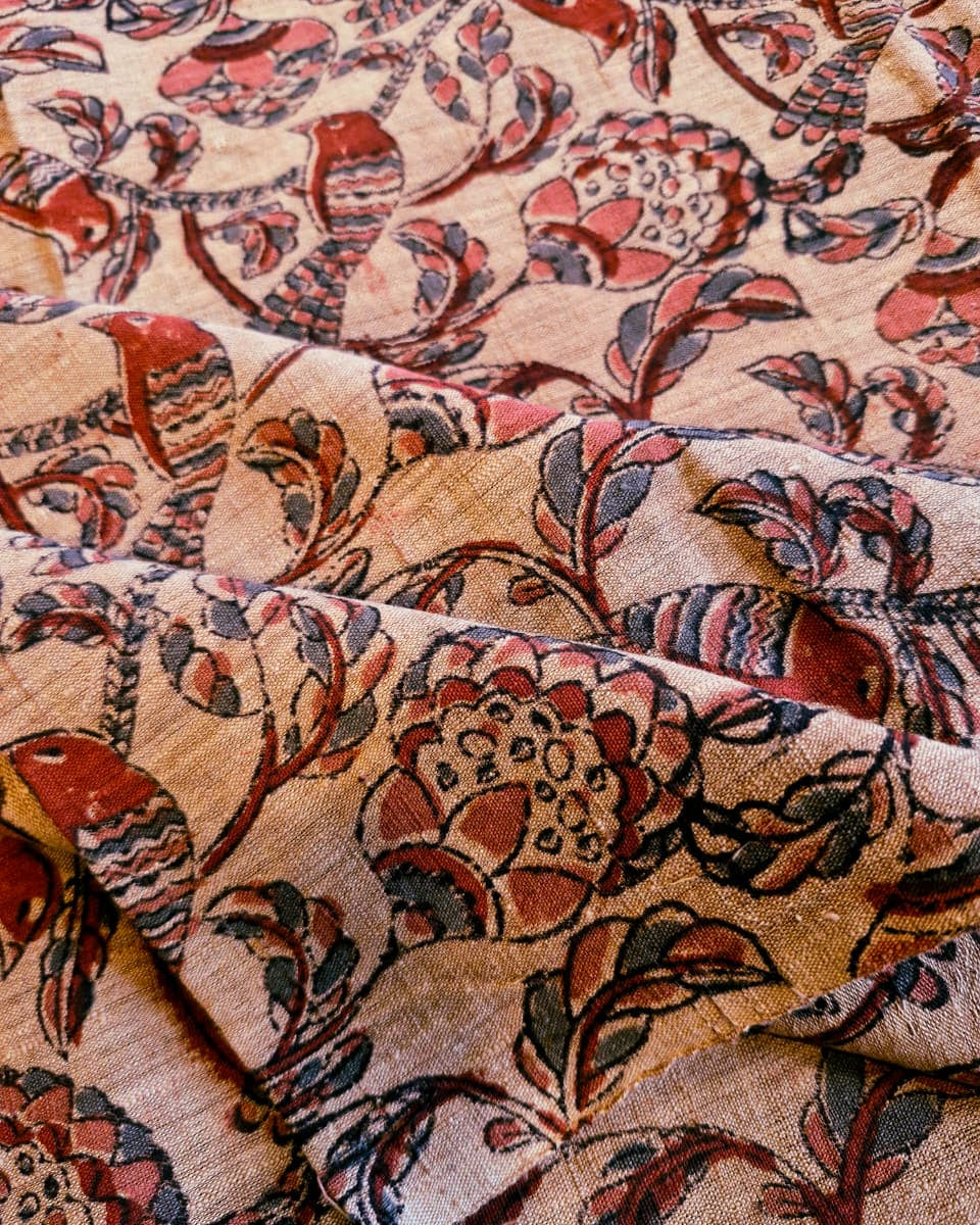 The traditional wooden block printing technique of the Machilipatnam region, some surmise that this was imported from Persia in the sixteenth century. Featuring predominantly botanical motifs, the ones we favor at Malkha feature butterflies, the palapitta and kokila birds, pineapples, peepal leaves and flowers. Our printers pre-treat the fabric to be printed with an exacting method of vegetable treatments.