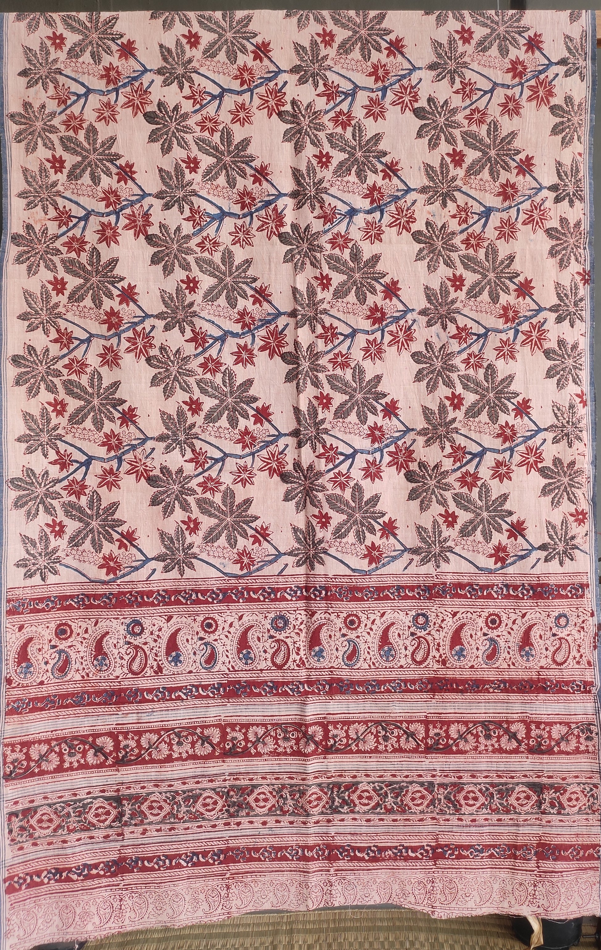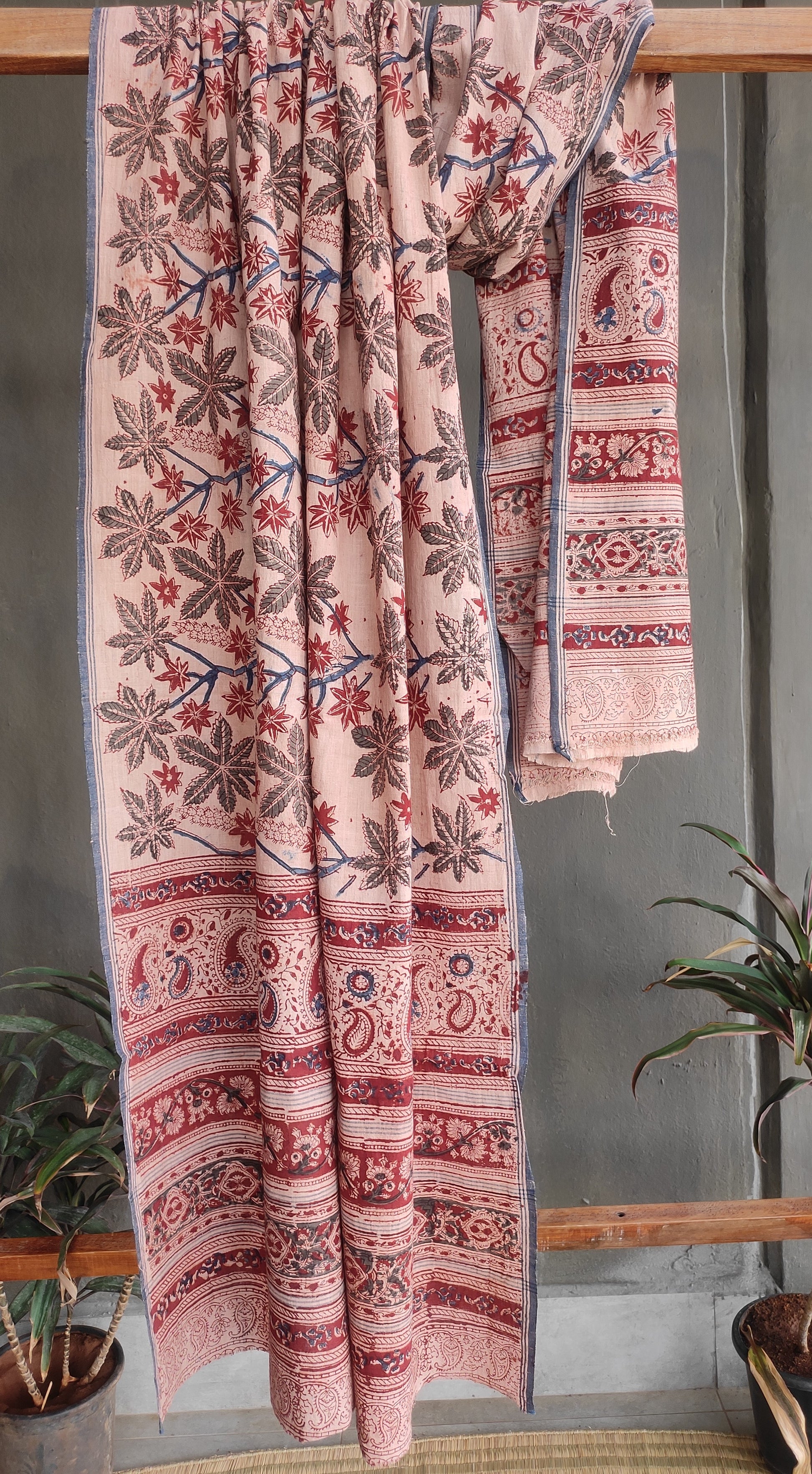 The traditional wooden block printing technique of the Machilipatnam region, some surmise that this was imported from Persia in the sixteenth century. Featuring predominantly botanical motifs, the ones we favor at Malkha feature butterflies, the palapitta and kokila birds, pineapples, peepal leaves and flowers. Our printers pre-treat the fabric to be printed with an exacting method of vegetable treatments.