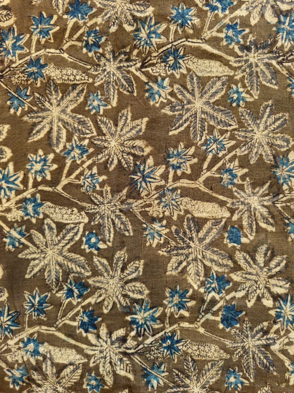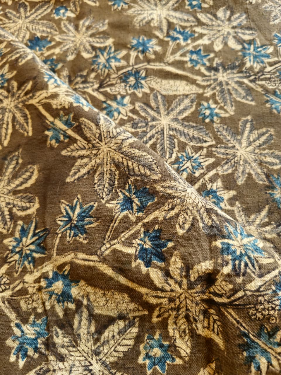The traditional wooden block printing technique of the Machilipatnam region, some surmise that this was imported from Persia in the sixteenth century. Featuring predominantly botanical motifs, the ones we favor at Malkha feature butterflies, the palapitta and kokila birds, pineapples, peepal leaves and flowers. Our printers pre-treat the fabric to be printed with an exacting method of vegetable treatments.