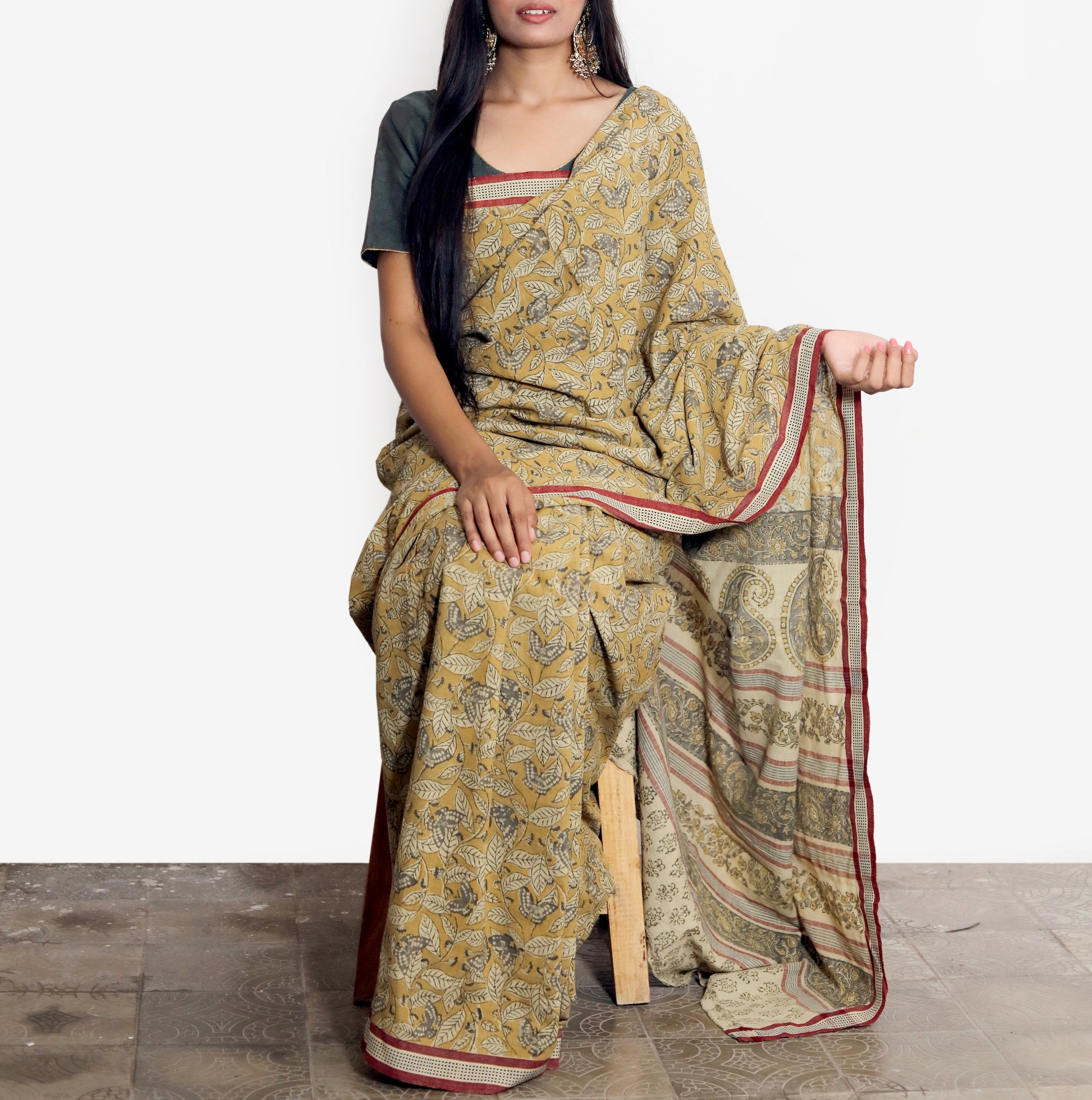 KALAMKARI SAREE : ANAR YELLOW : LIGHT MEHNDI GREEN : KORA
