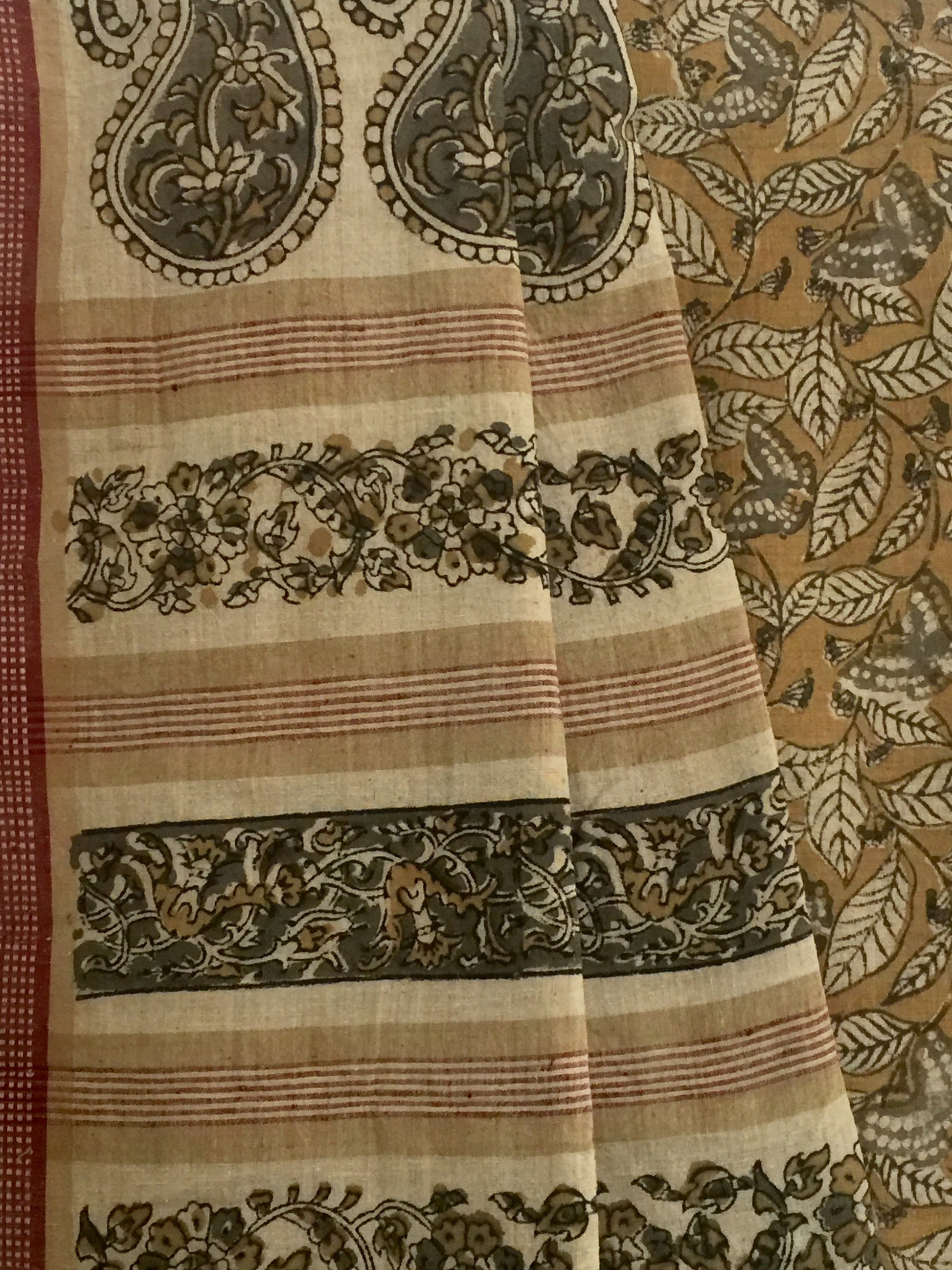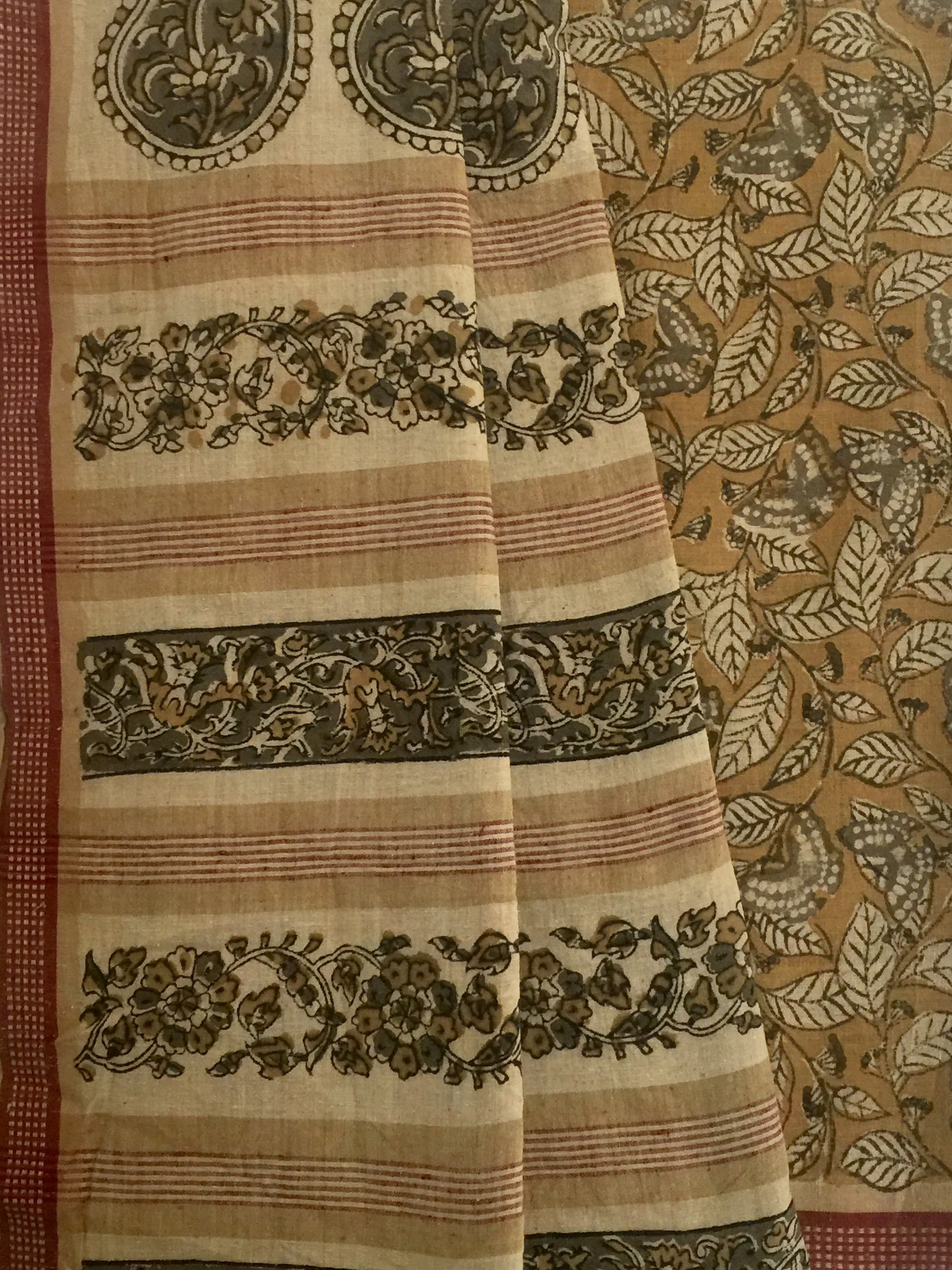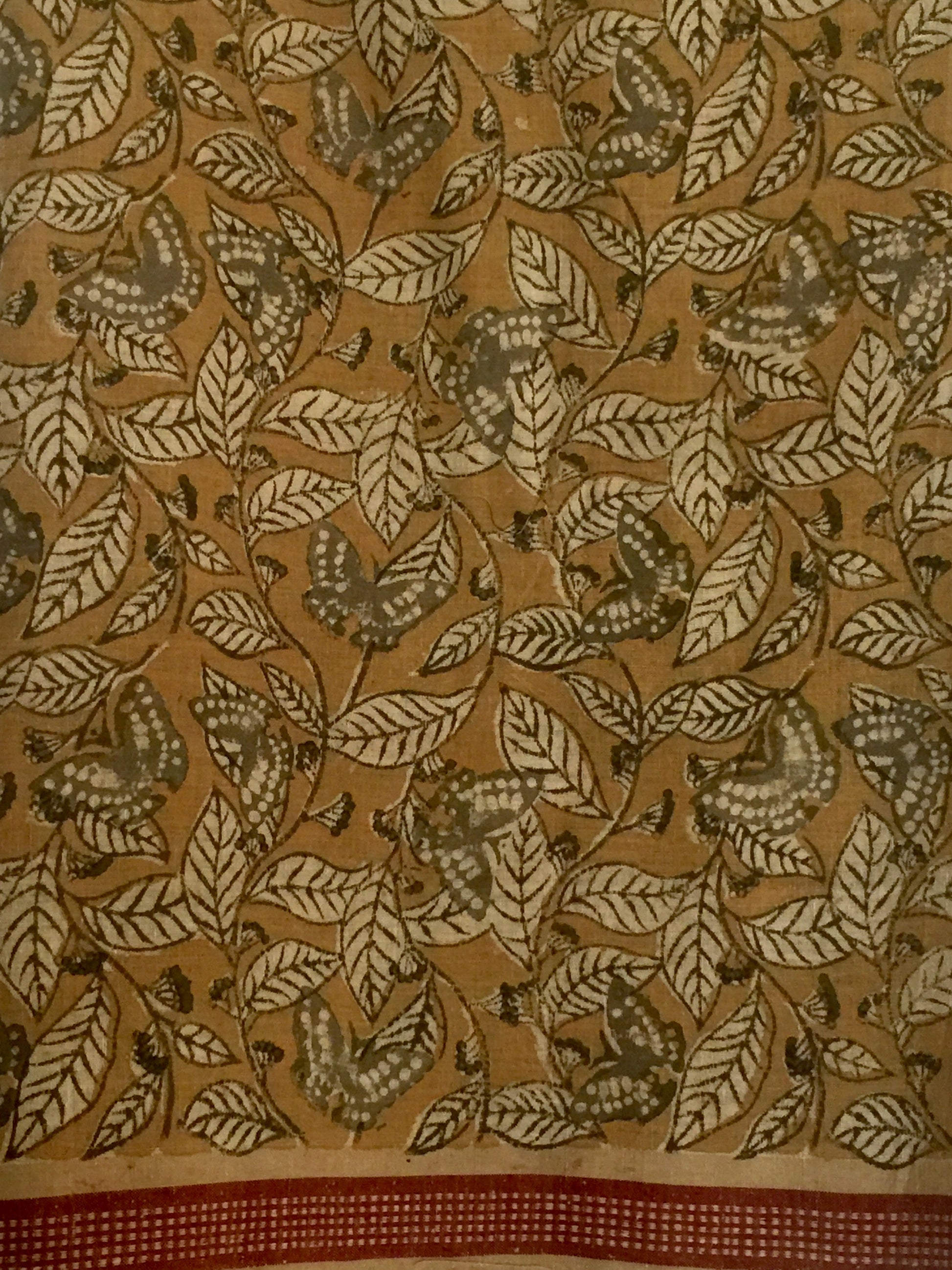 The traditional wooden block printing technique of the Machilipatnam region, some surmise that this was imported from Persia in the sixteenth century. Featuring predominantly botanical motifs, the ones we favor at Malkha feature butterflies, the palapitta and kokila birds, pineapples, peepal leaves and flowers. Our printers pre-treat the fabric to be printed with an exacting method of vegetable treatments.