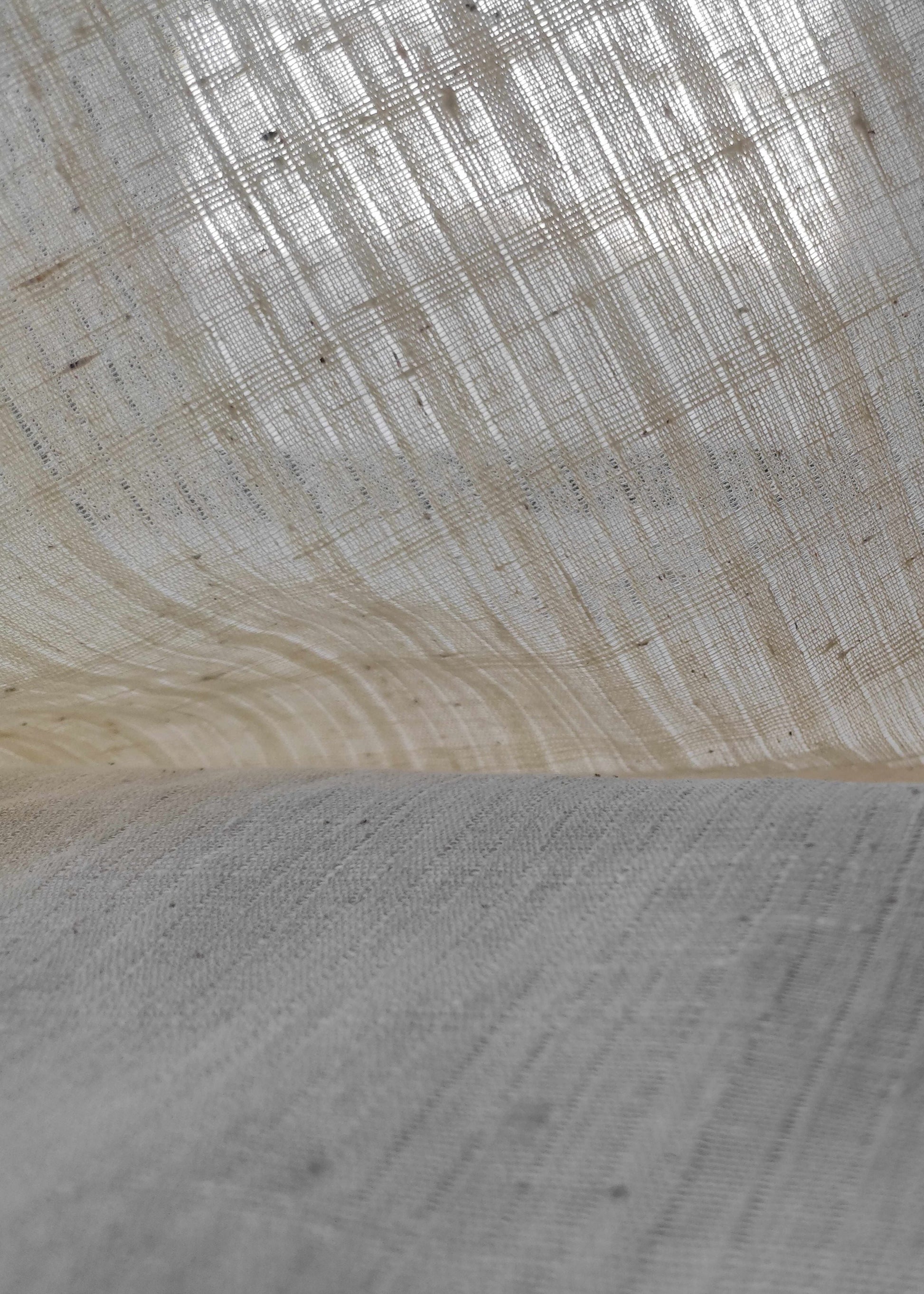 Organic local cotton, decentralised spinning techniques, handwoven density variations.