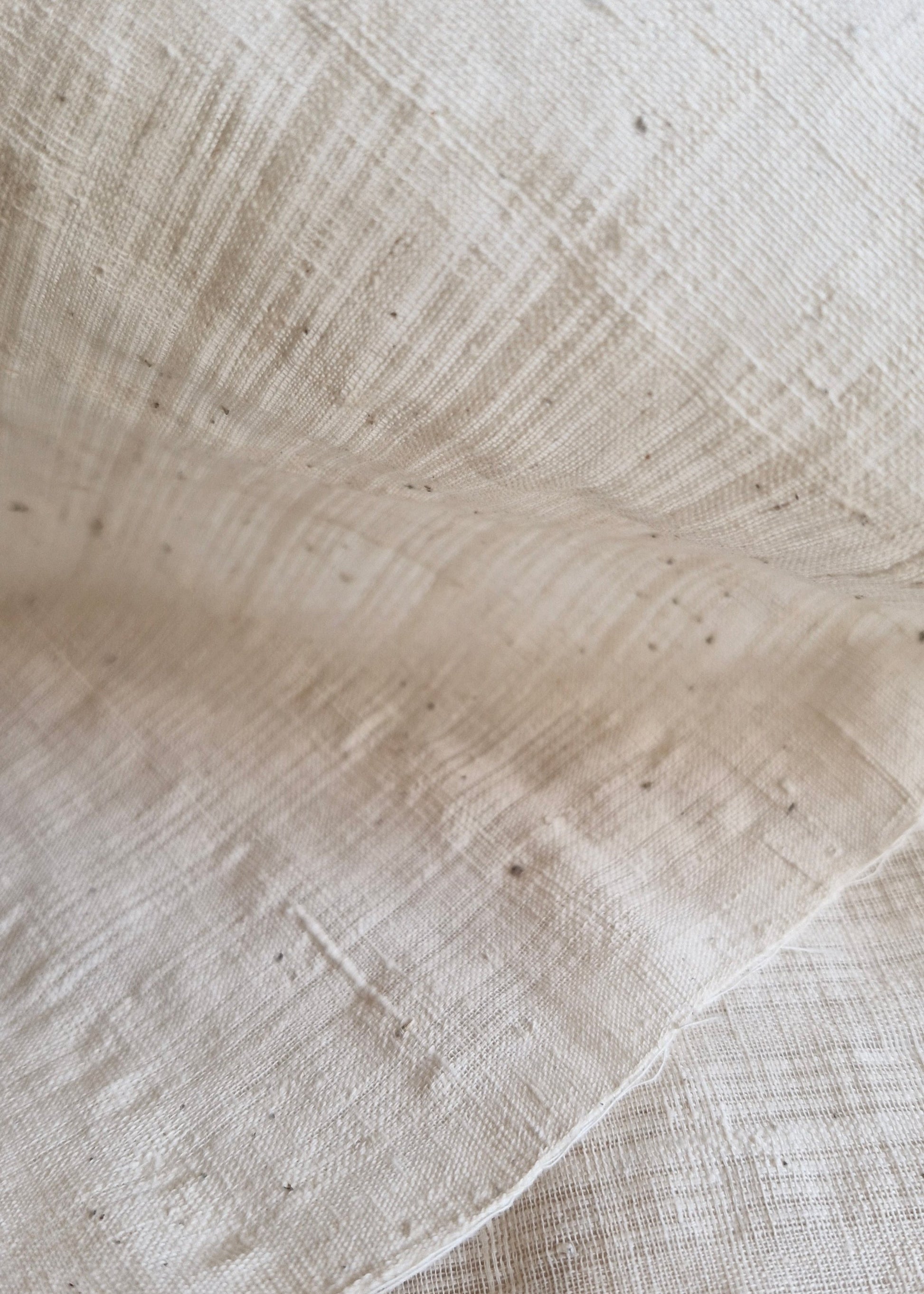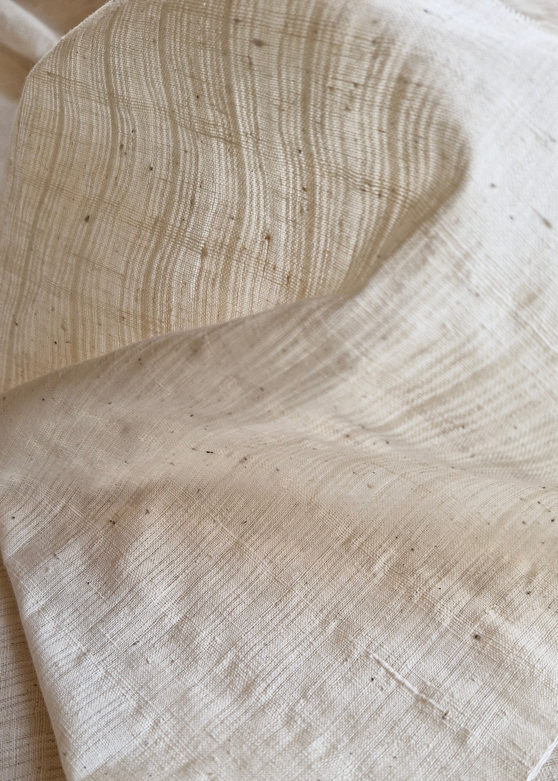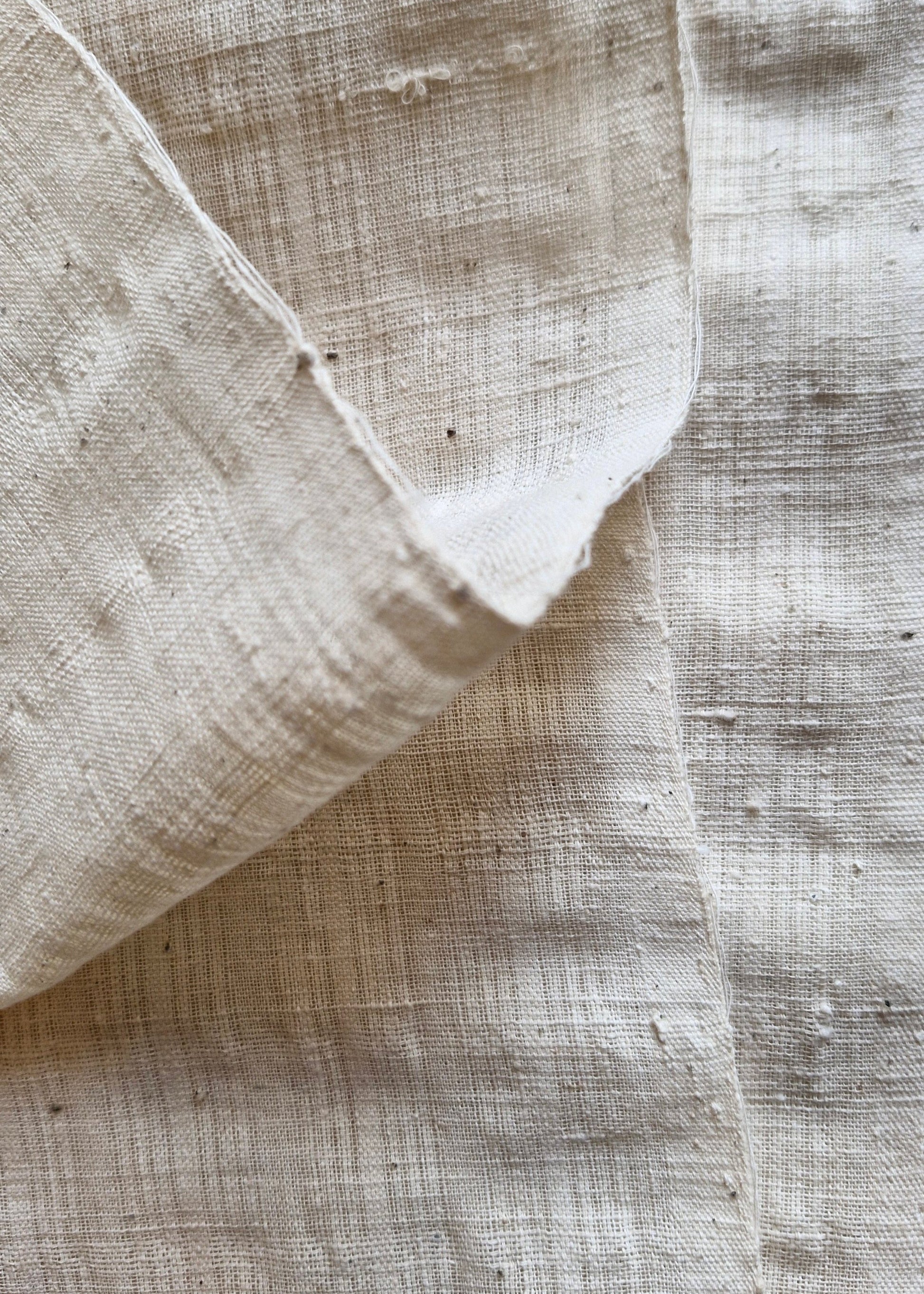 Organic local cotton, decentralised spinning techniques, handwoven density variations.