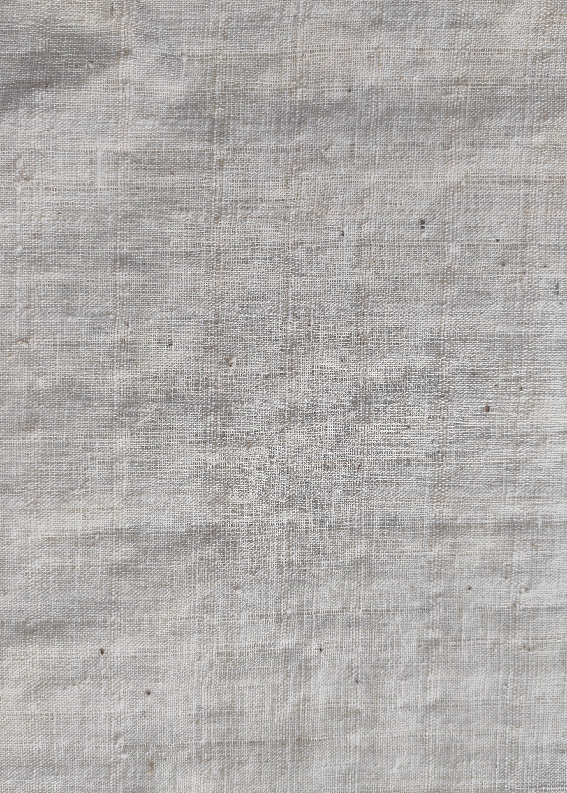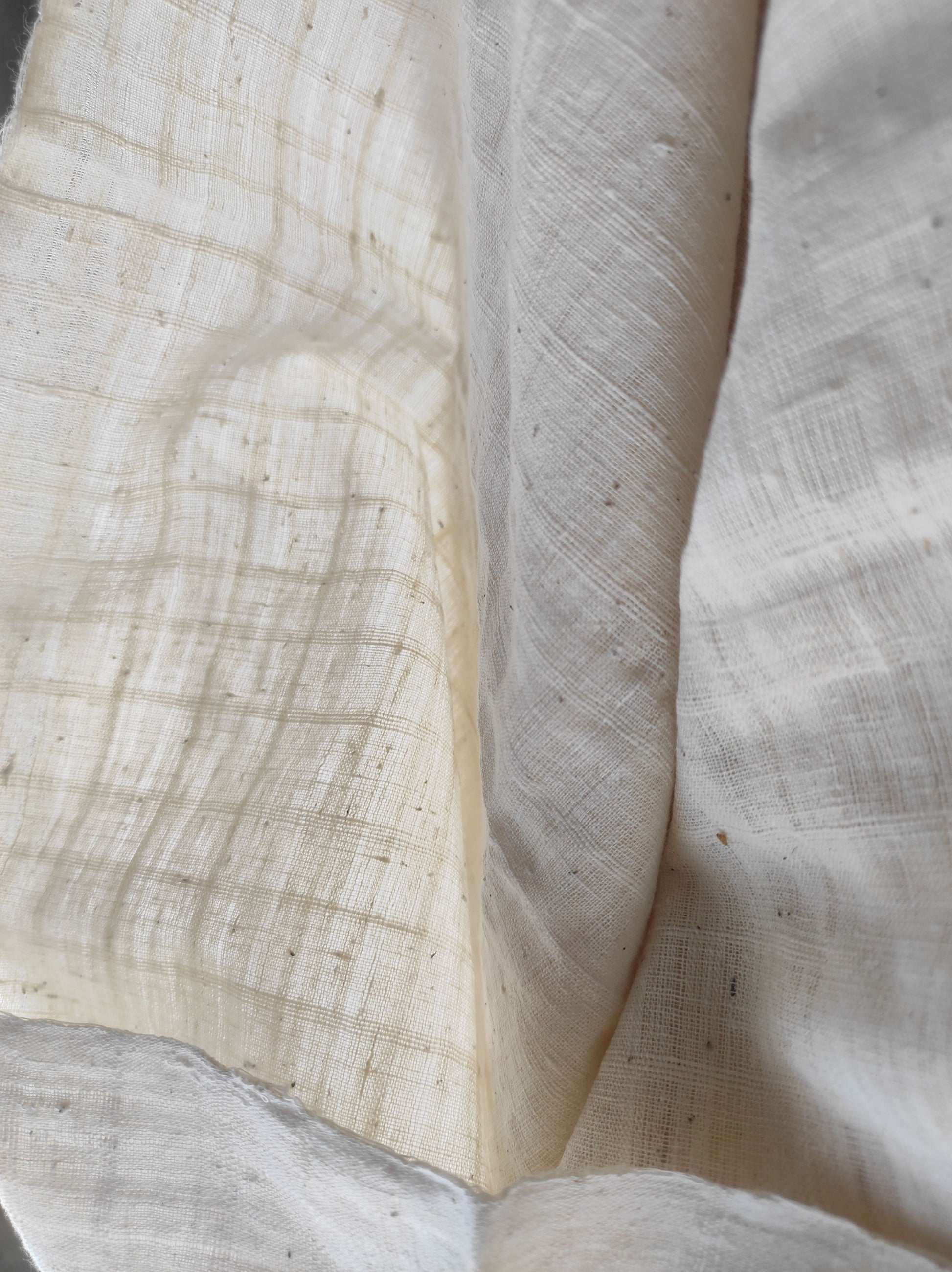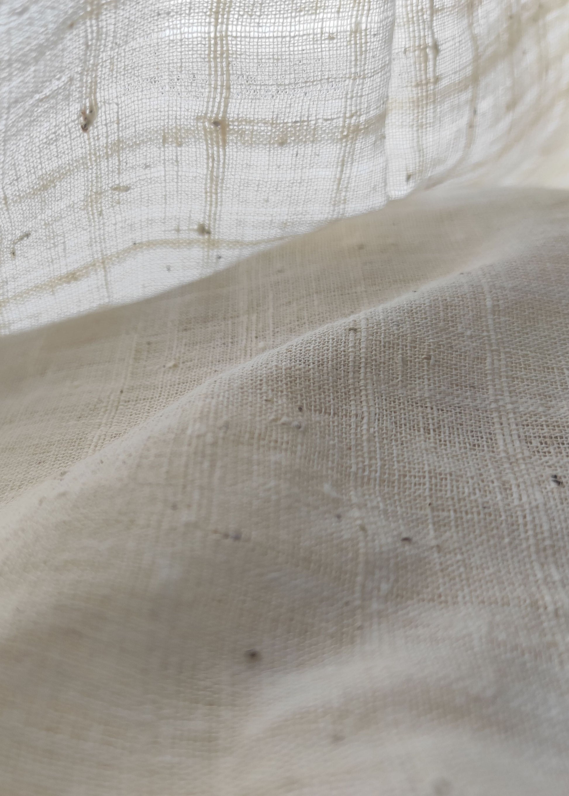 Organic local cotton, decentralised spinning techniques, handwoven density variations.
