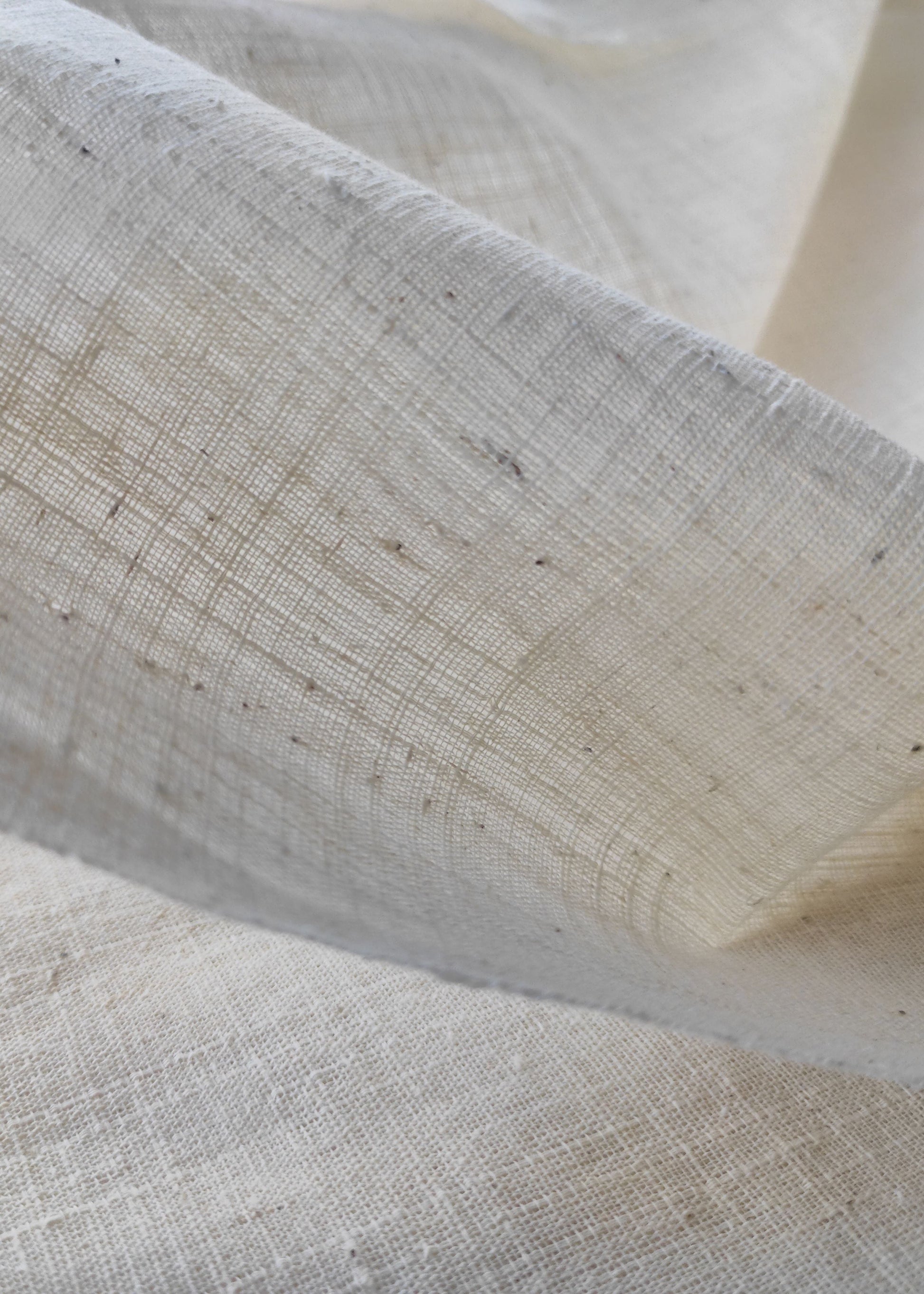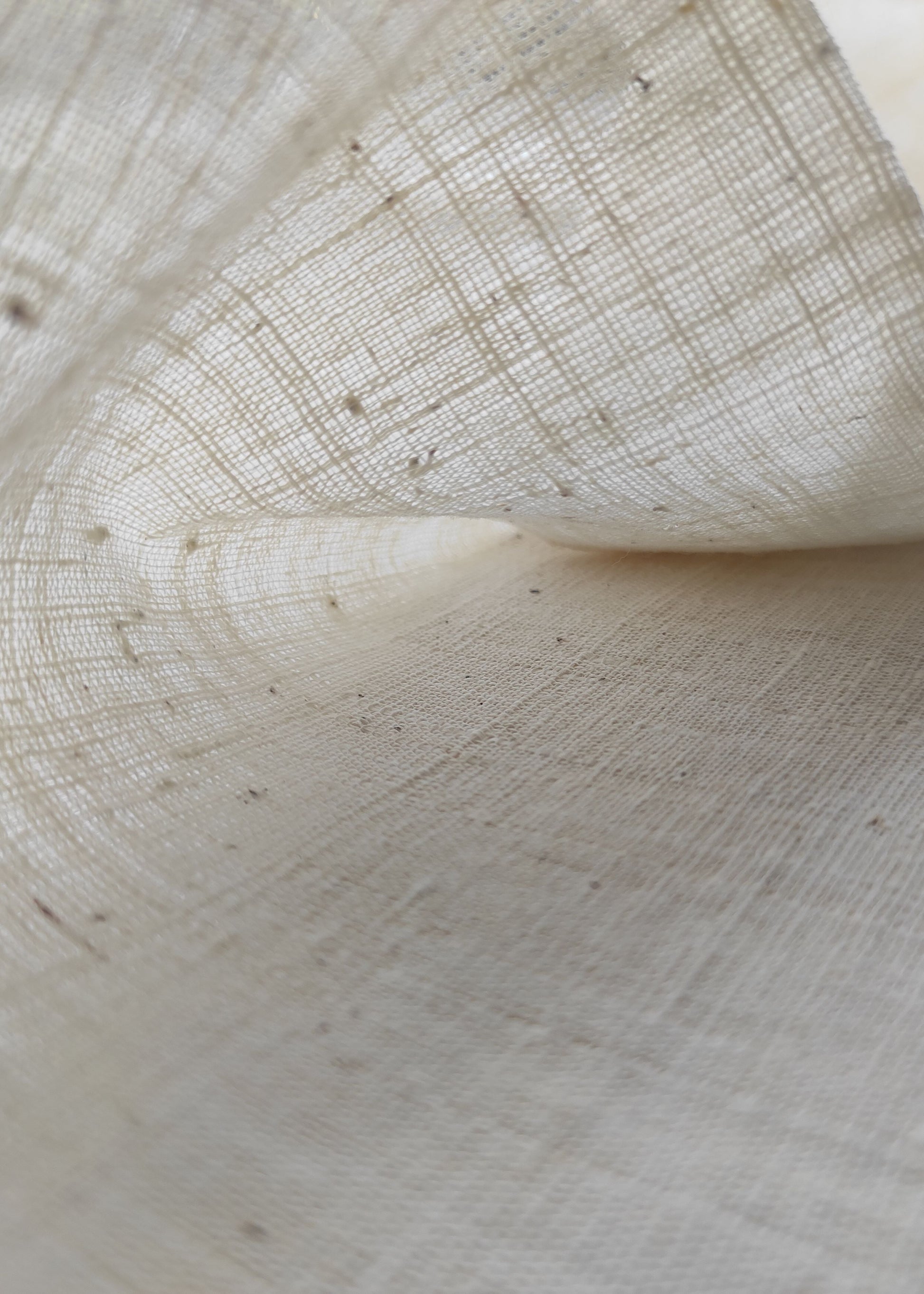 Organic local cotton, decentralised spinning techniques, handwoven density variations.